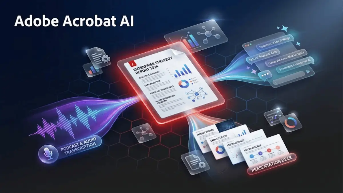 Adobe (Nasdaq: ADBE) announced on January 21, 2026, that Acrobat now transforms PDFs into podcast-style audio summaries and presentation decks through AI-powered chat interfaces, marking a strategic shift from static document tools to dynamic content creation platforms. The features deploy within Acrobat Studio, Adobe’s productivity workspace that integrates Document Cloud capabilities with Adobe Express creative tools.