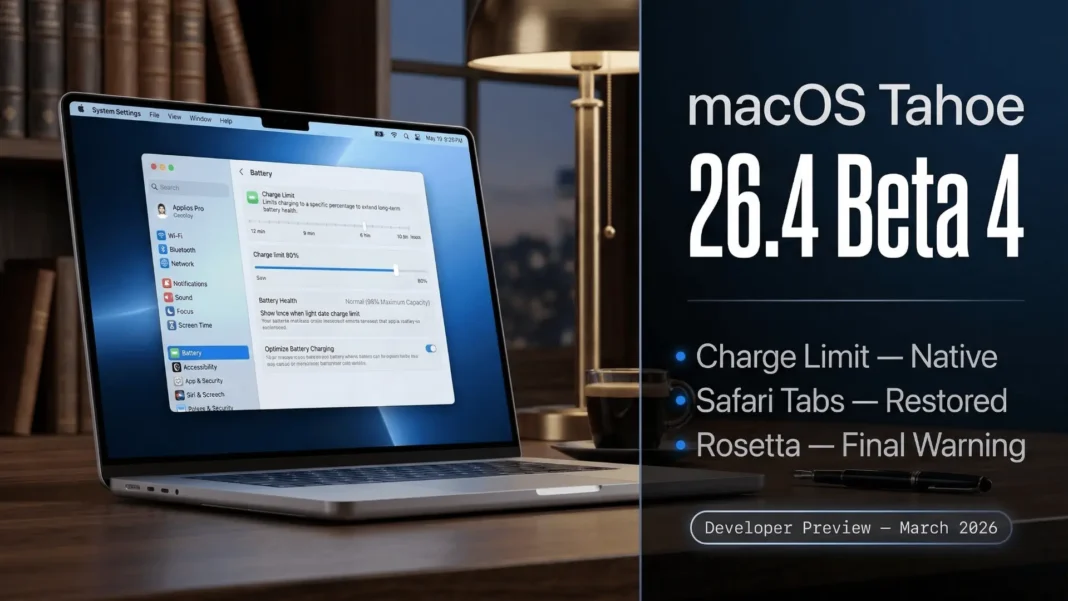 Apple shipped macOS Tahoe 26.4 Beta 4 on March 9, 2026, and it is not a routine update. Four substantive changes land in this build that affect MacBook battery health, browser usability, a persistent UI bug, and the long-term fate of Intel-era apps on every Mac. This article covers each change, explains what it means for everyday users, and walks through how to install the beta safely.