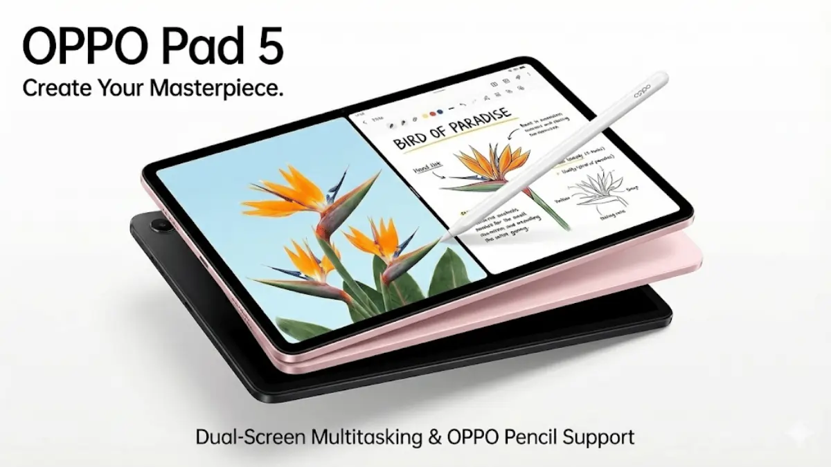 OPPO has confirmed the India launch of its Pad 5 tablet through an official microsite on Flipkart. The device is expected to debut alongside the Reno 15 series smartphones in late December 2025 or early January 2026. Key specifications include a 12.1-inch 2.8K display, 10,050mAh battery, and stylus support in Black and Pink color options.