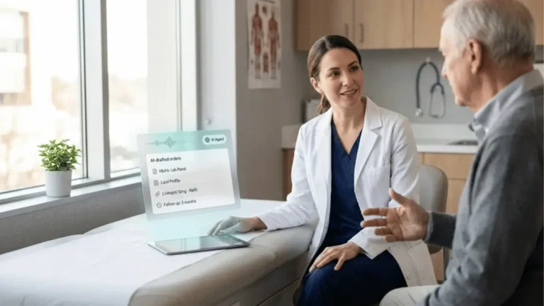 When the clinician says, “Let’s renew your blood pressure medication, adjust your insulin dose, repeat your A1c and kidney function labs, and schedule you back in three months,” the agent drafts renewal prescriptions, new dosing orders, lab panels, and a follow-up appointment automatically. At the end of the visit, the physician opens a single review pane showing the drafted note and bundled orders, makes small edits, and approves everything with a few clicks.