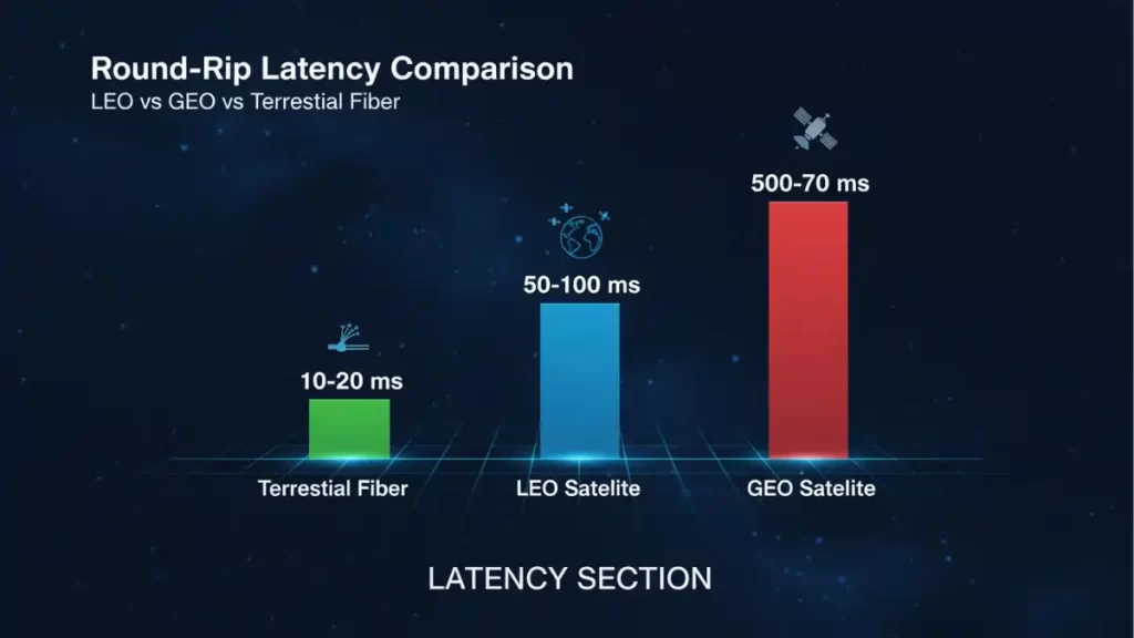 | Latency | LEO tens of ms; GEO hundreds of ms | Fiber <10 ms metro; ~50–100 ms inter-city |