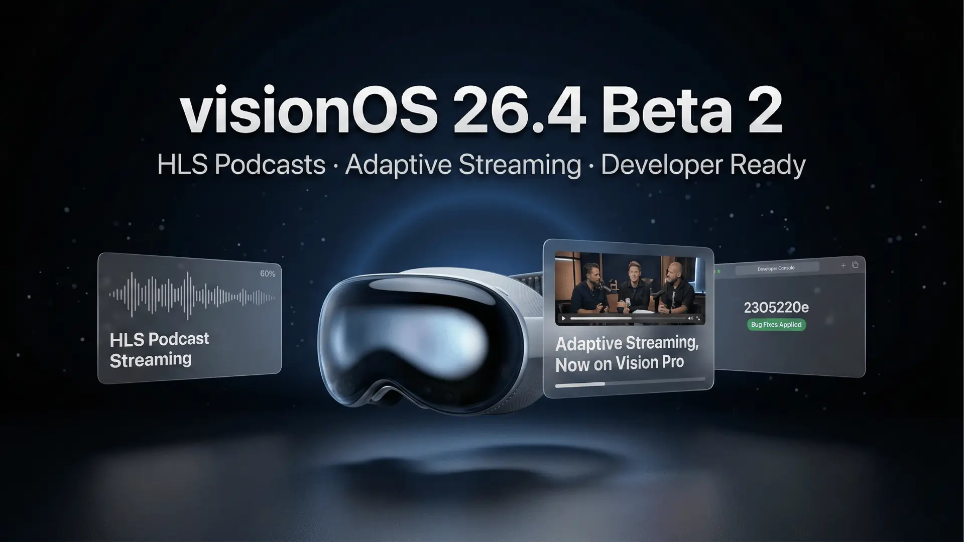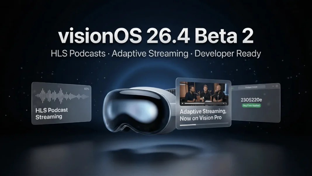 visionOS 26.4 Beta 2 is a developer-only release and should not be installed on a primary device. The HLS podcast and adaptive streaming features introduced in Beta 1 require third-party app developers to update their apps before end users see any direct benefit. Apple has not confirmed a public release date for visionOS 26.4.