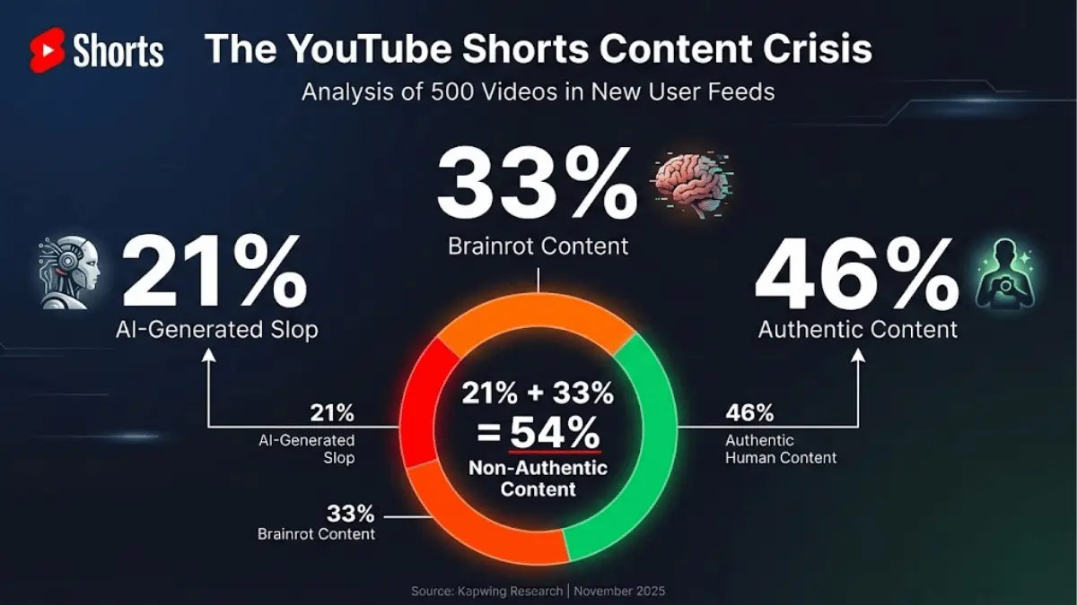 According to Kapwing’s November 2025 research, 21% of YouTube Shorts shown to new users are AI-generated slop, while 33% consist of brainrot content. This means over half of new user recommendations are low-quality, algorithmically optimized videos rather than authentic human creativity.